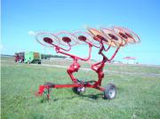 指盘搂草机系列,适合挂接在轮式拖拉机的三点悬挂装置上,工作部件为带搂齿的指盘,机器靠指盘按顺序传至后一个指盘,直到形成松散通风的草条为止。