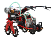 小型汽油机垄上自走款气吸蔬菜播种机; 可精播包括萝卜、白菜、甜菜、芥菜等垄上蔬菜药材; 开沟、播种、覆土、镇压一体成型; 一穴一粒气吸直播,省种省人工免间苗。